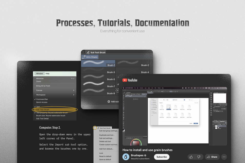 Knowing that we've aimed to create a perfect collection of grainy brushes able to satisfy the needs of digital artists using different software: Procreate, Photoshop, Illustrator, Affinity Designer, and Clip Studio Paint.
