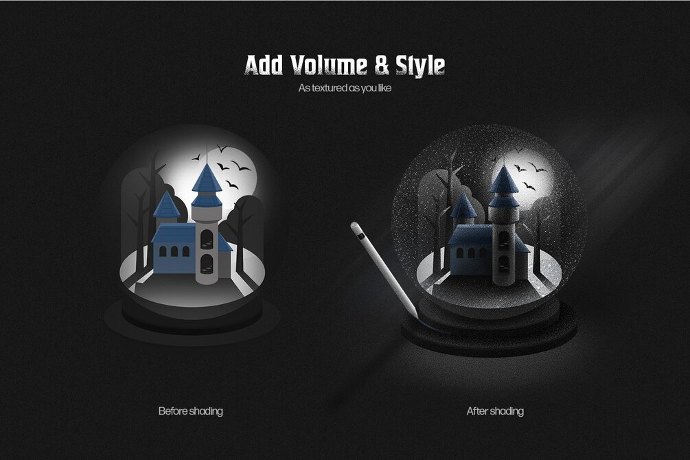 Grim Shader Brushes for Affinity enable an artist to smoothly add a texture to an object, whether they want it subtle or intense.